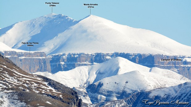 Zoom sur le Canyon d’Ordesa avec la vire des fleurs et la Punta Tobacor (2769m).