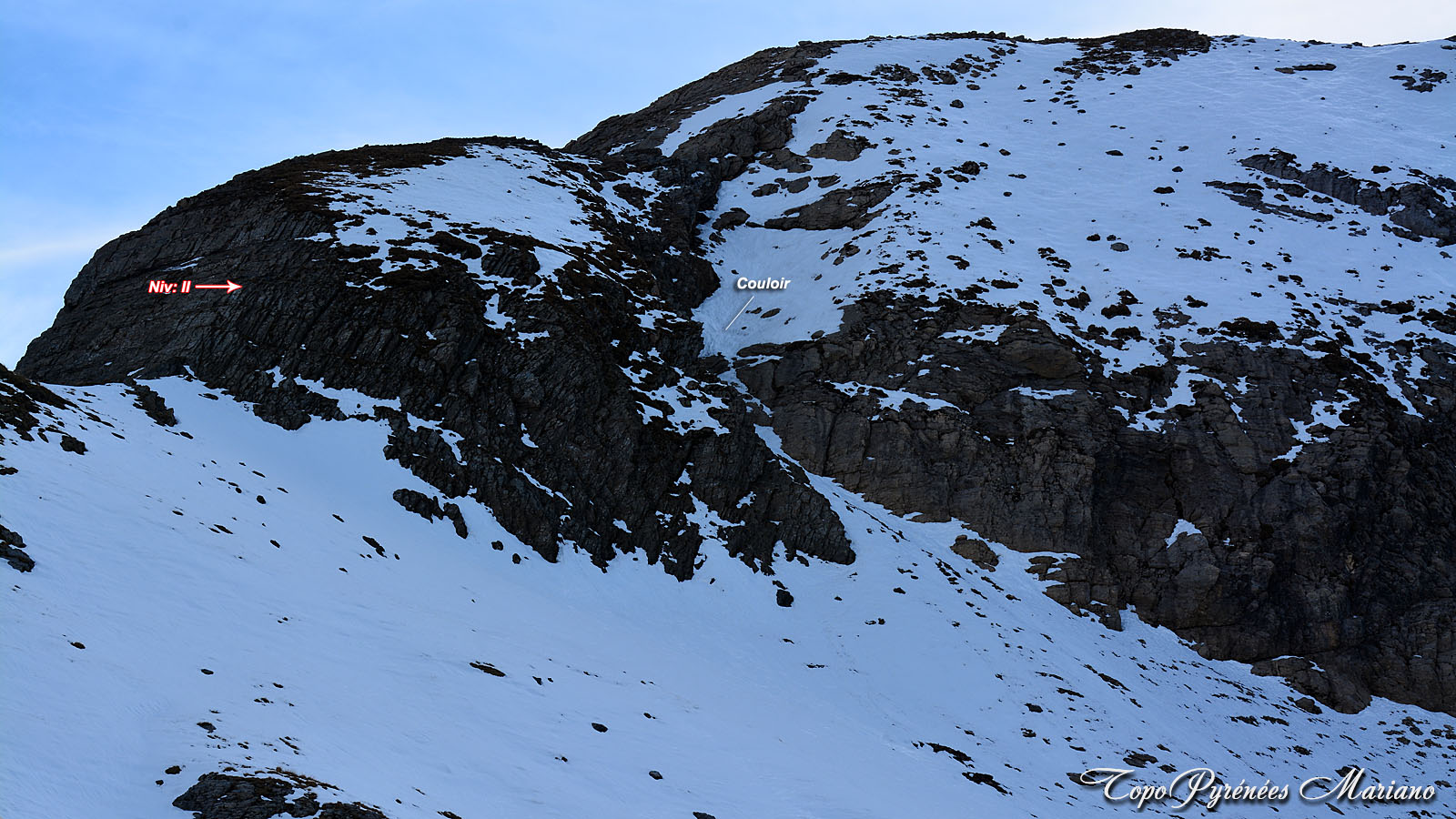 Couloir pentu, avec par moment l’utilisation des mains mais sans grand danger.