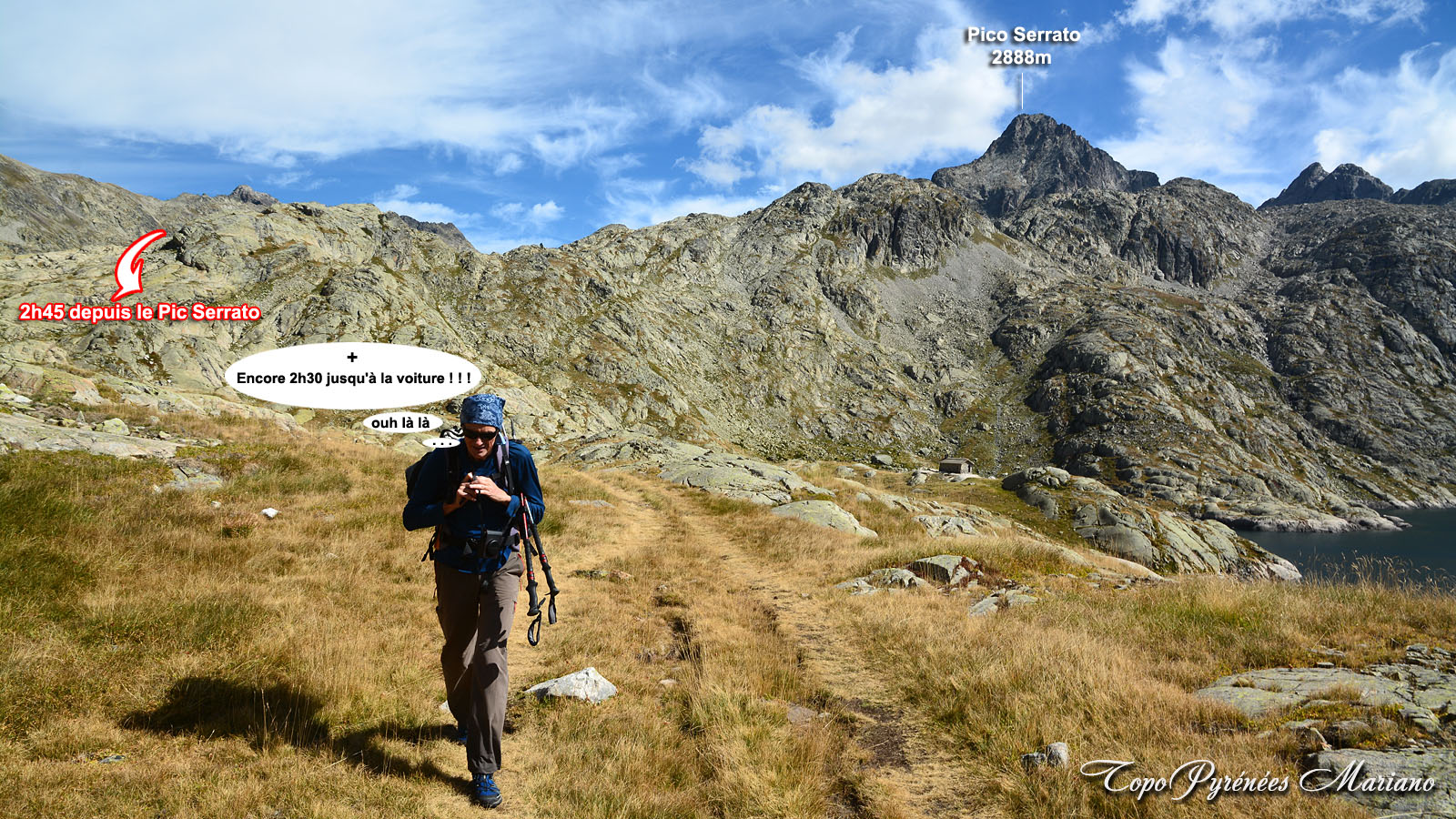 2h45 depuis le sommet du Pic Serrato (6h45 depuis le départ) 7h30 avec la pause de midi.