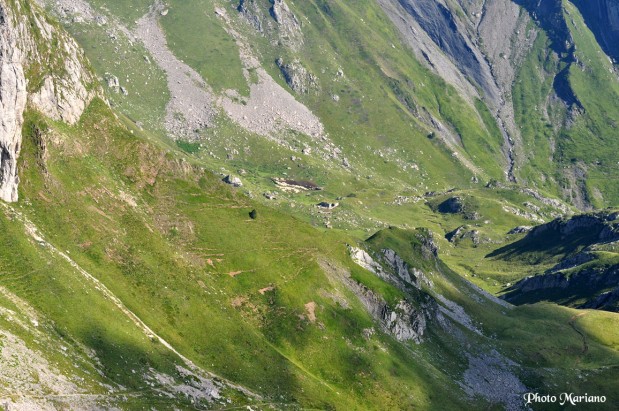 Vue plongeante sur la cabane de Bonaris (400m plus bas)