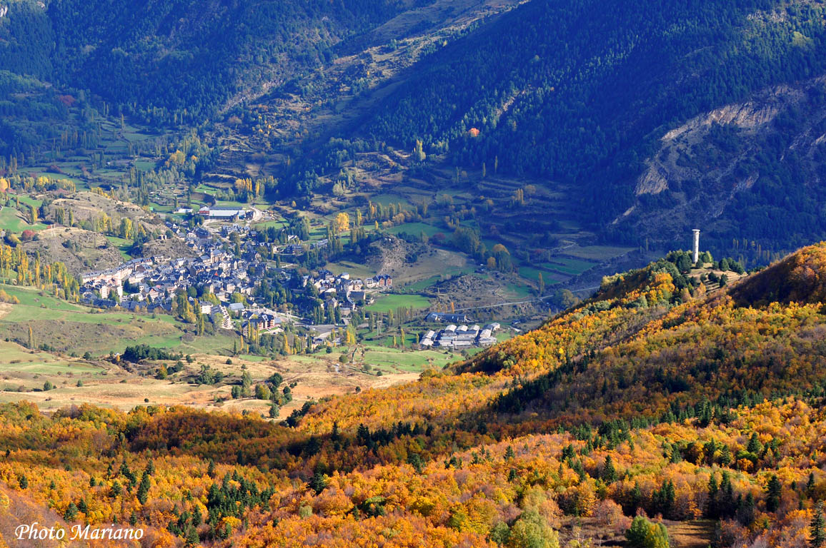 Vue plongeante sur Sallent de Gállego depuis le bord de la crête de la Tosquera.