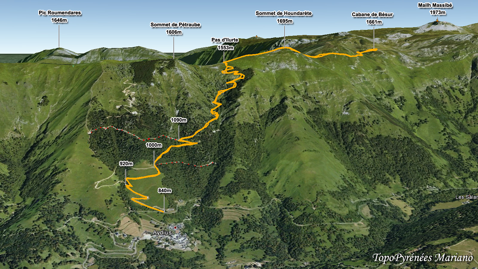 Sommet de Houndarète (1695m) en 2h25 (compter 2h45) aucune difficulté depuis le village d’Aydius.