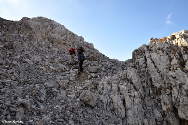 La progression dans cette zone de lapiaz est lente, monter légèrement à droite de la fissure en cherchant le passage le moins abrupt et lisse. Passage déconseillé par mauvais temps (risque de glissade).