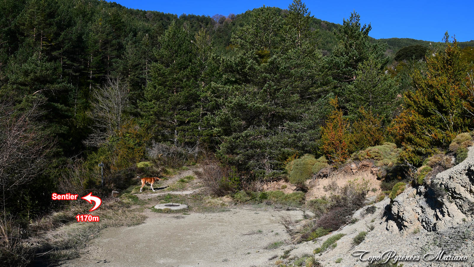 Depuis le haut du village, prendre à gauche (altitude 1100m) la piste qui passe à droite des 2 dernières maisons du village (Sud-Ouest).