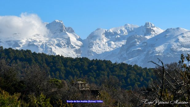 Le 22/04/12 nous avions été surpris par la crête impressionnante de ce petit sommet de 1465m, depuis Sinues. Ce 5/02/22, nous voilà repartis dans ce secteur d’Aisa pour démarrer ce coup-ci dans le petit hameau de Las Tiesas Altas 910m environ. Nous avons pris la piste juste avant le petit village au nord puis tourné à gauche jusqu’au collada balèn, 985m puis avons suivi à droite jusu’au bas de la crête 1015m, env puis sommes montés à la 1ère pointe 1189m puis redescendons, poursuivons la piste jusqu’à la collada Fonda ou Lebur 1218m pour monter à la Capezola 1313m avec difficulté très boisée et raide (pas de vue du sommet !) Retour au col (en suivant nos cairns mis en montant) nous sommes montés au sommet de la Sierra de Luesia 1305m env. Puis descendons l’autre côté entre coussinets de belle-mère et arbustes jusqu’à la piste pour monter à la Punta Collada 1413m et redescendons au NE pour rejoindre la piste qui nous mène jusqu’à la brêche Contadero 1436m, courte descente jusqu’au pied de la face Sud du Pietrola. Mon frère parviens au sommet de Pietrola par la face Sud (rocher médiocre) pendant que moi j’essayais d’atteindre le petit col face est (trop raide et éboulis croulant pour l’atteindre bien que j’avais franchi les nombreux arbustes qui me gênaient) Me voici donc longer la paroi pour revenir à l’endroit où mon frère a escaladé. Il me rejoint en désescaladant assez difficilement tellement le rocher est friable. Nous redescendons à la piste et contournons la face Ouest et longeons la paroi face nord entre les arbustes pas trop évident pour retrouver enfin la face est (voie la plus normale qui est quand assez technique et il faut s’assurer que tous les rochers tiennent bien. Malheureusement, la Collarada a fini par se boucher, alors que de la Sierra de Alano au Pico de Lecherines cela s’est plutôt dégagé. Belle journée passée sans encombre surtout, bien que cela n’ait pas été toujours évident.