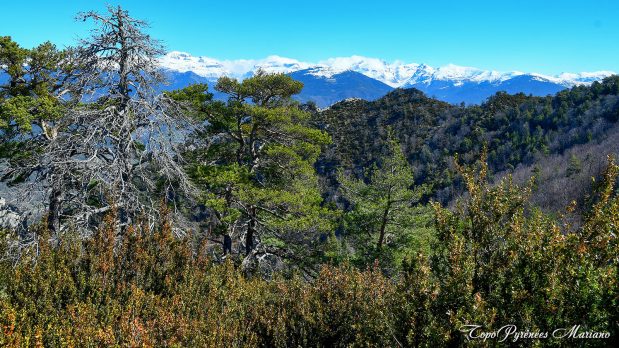 La vue derrière moi sur les sommets enneigés des Pyrénées.