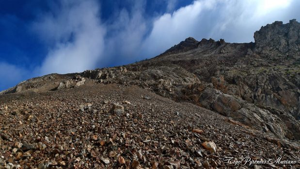 Vers 2580m, viser la base du col de l’Argualas entre le Pic Argualas à gauche et le Garmo Negro à droite.
