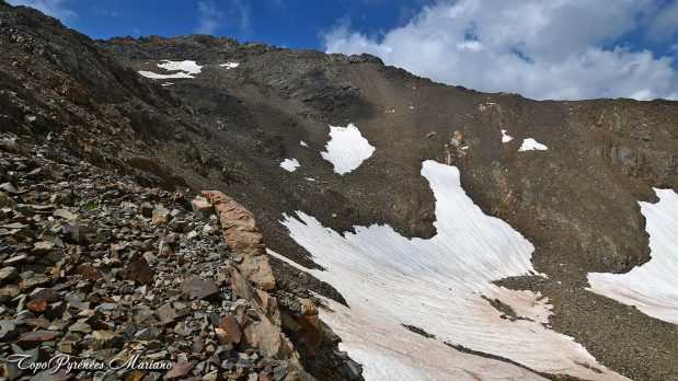 Nous concernant nous avons évité les névés en prenant à droite avec juste un passage sur un petit névé d’une trentaine de mètres.
