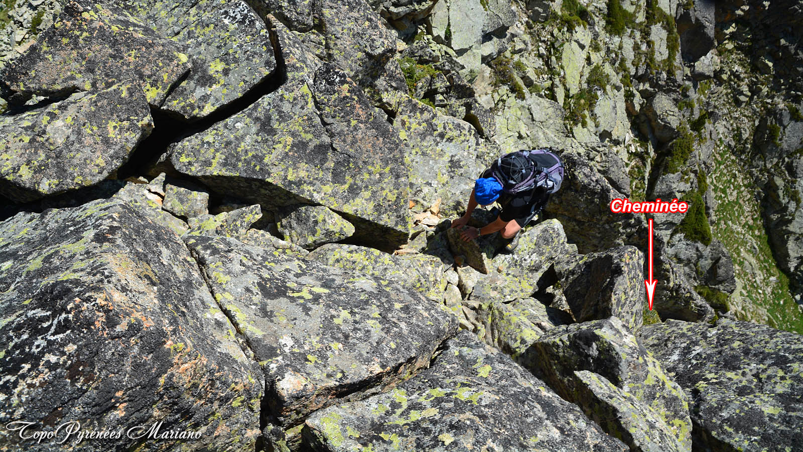 Depuis le col, redescendre vers le Sud-Ouest sur 150m, puis viser la brèche (photo).