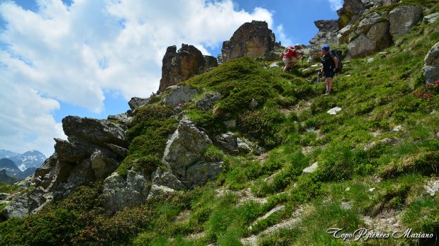 sur une sente bien marquée avec la possibilité de couper les virages dans le pierrier (cairns).