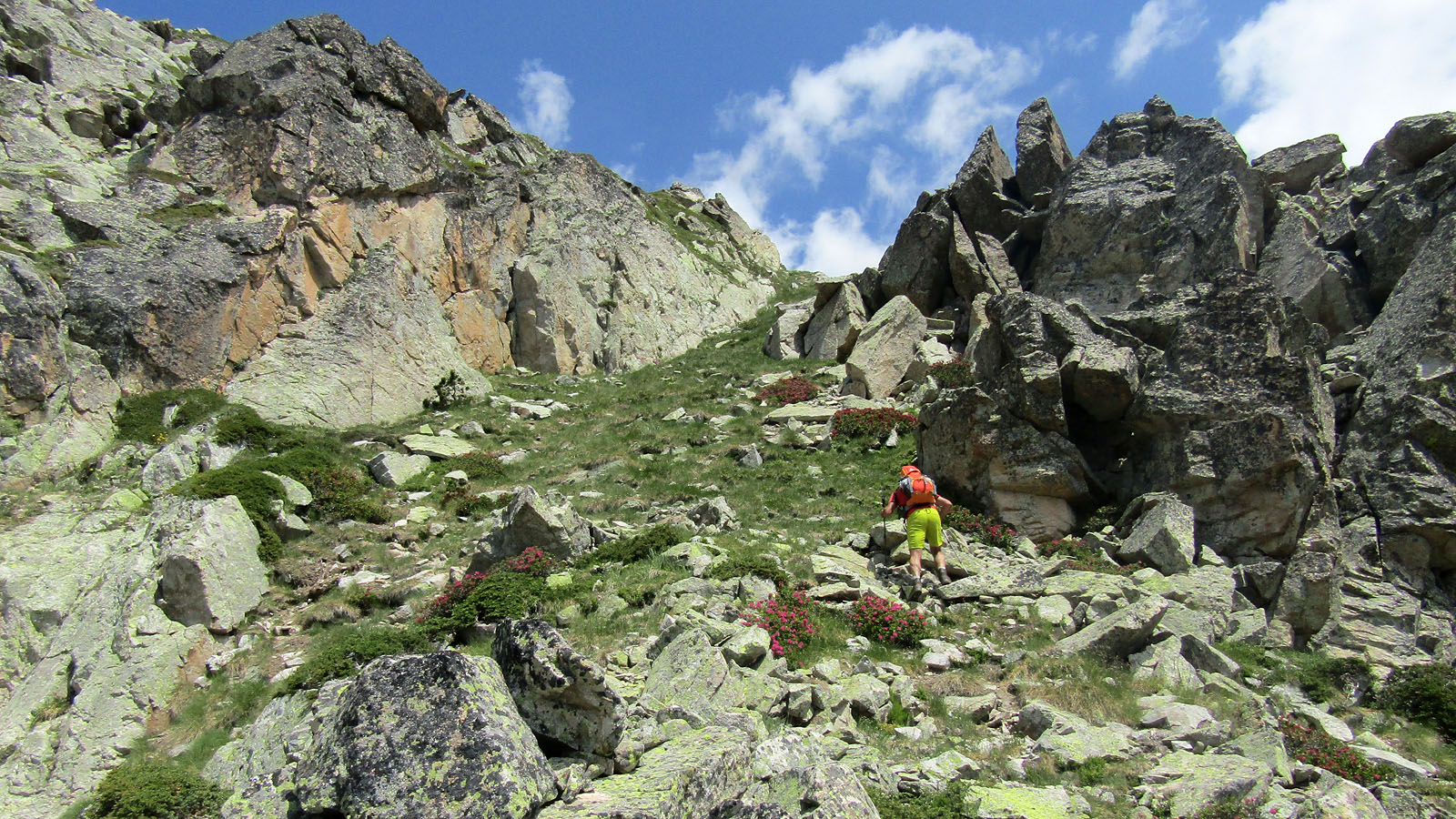 Pic de Courounalas (2566m): Pentes herbeuses très raides + une cheminée d’une hauteur de 5m à escalader (niveau: II).