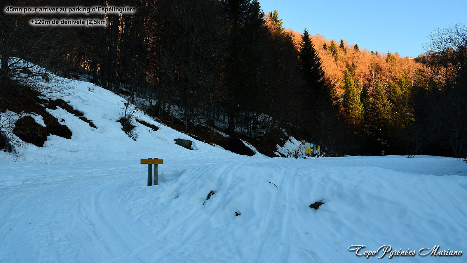 Depuis la centrale, suivre la piste qui part à droite et qui arrive très rapidement au parking d’Espélunguère