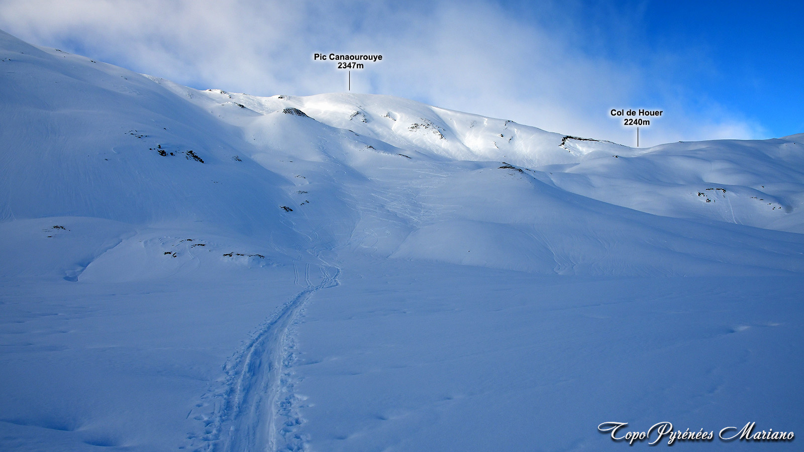 L’itinéraire de droite N°2 qui débute depuis la Cabane de l’Araille vers 1720m est l’itinéraire principal qui monte au Canaourouye, c’est d’ailleurs une véritable autoroute de montagne.