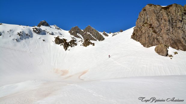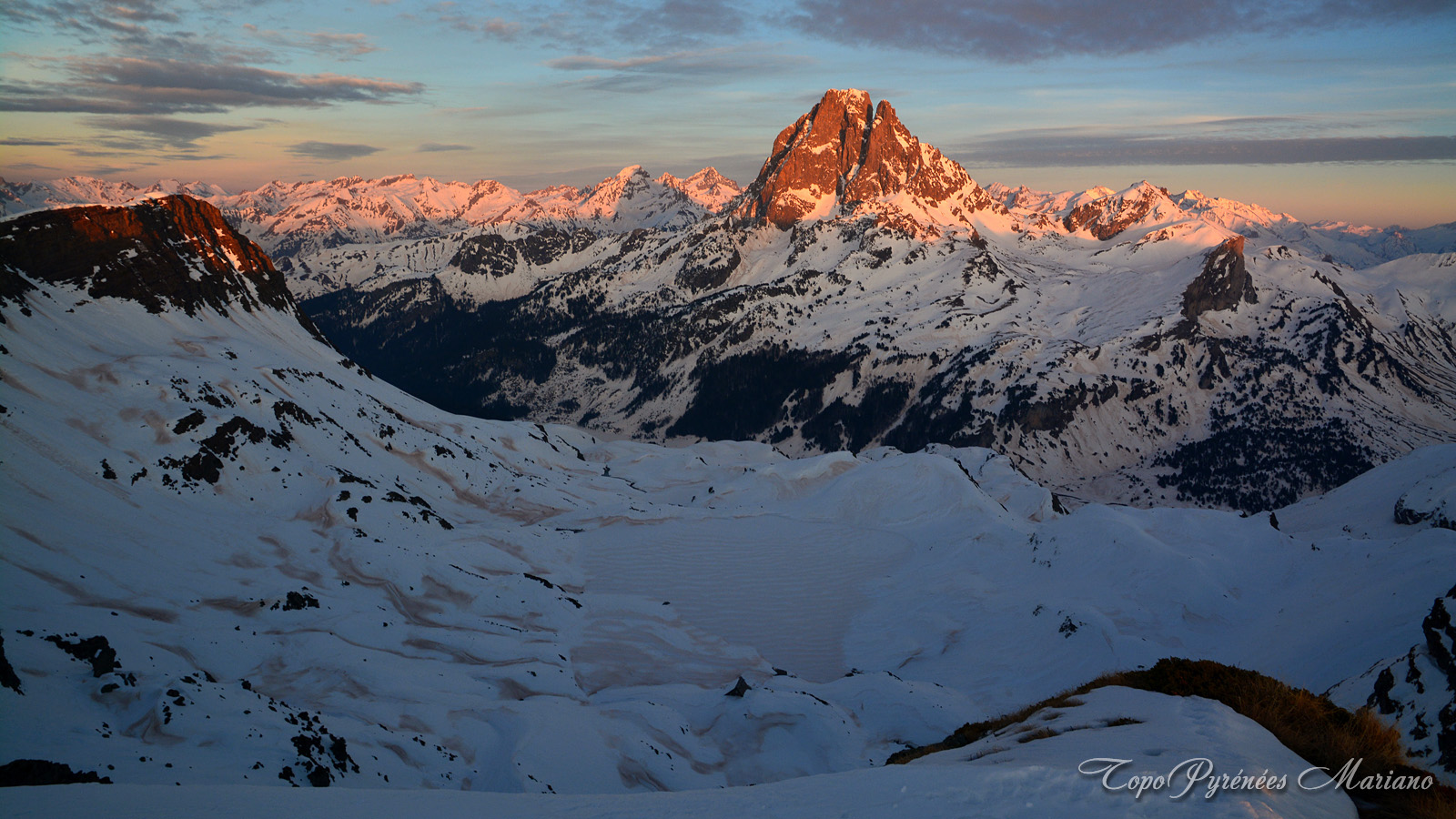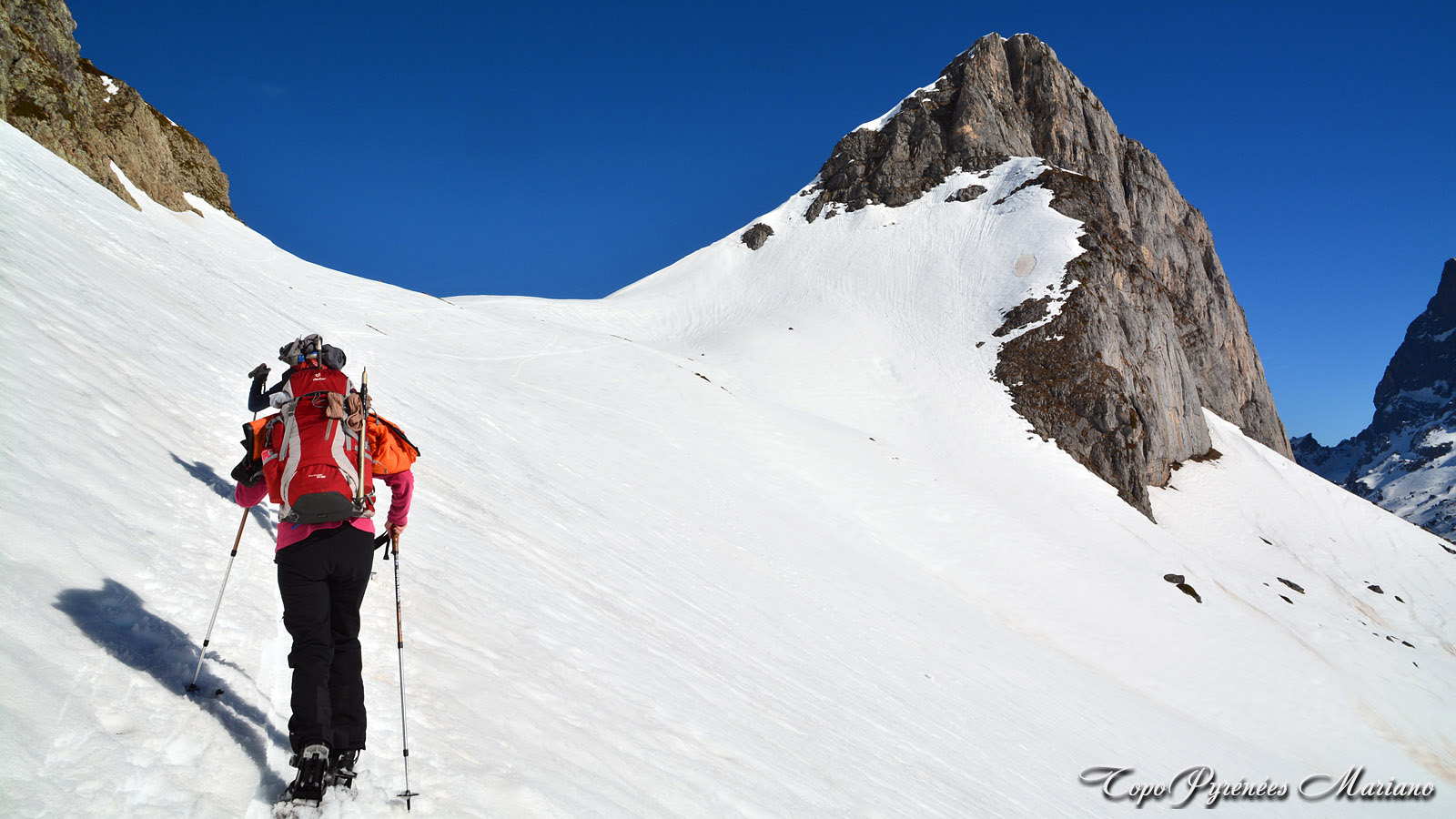 Difficultés: Pas de difficulté jusqu’au refuge d’Ayous par une journée de beau temps, la montée au lac Bersau est un peu raide et en dévers mais sans danger en cas de glissade. Crampons et piolet pour la partie finale du pic.