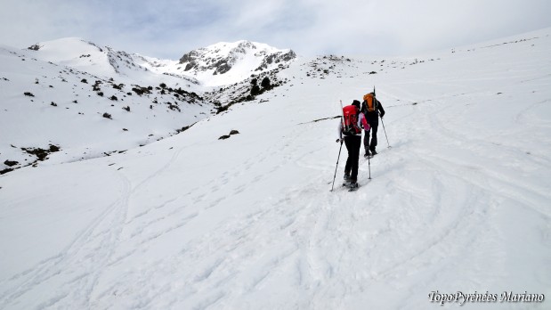 Avec une pente assez soutenue, le dénivelé est très vite avalé. Derrière nous les sommets du Plo del Naou (1754m), Le Mont-Né (2147m) et la Hourquette d’Ancizan (1564m).
