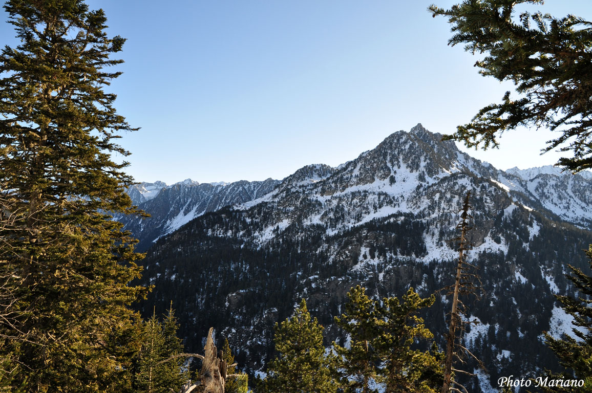 La descente se fait au milieu des sapins avec en toile de fond le Grand Vignemale 3298m.