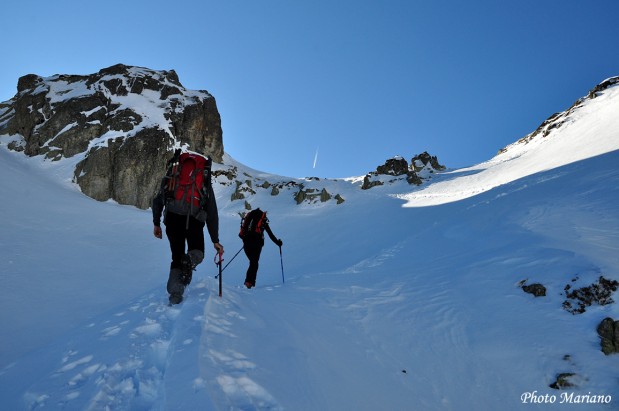 Après un nouveau replat, le vallon principal se divise en deux branches distinctes, celui de gauche qui accède à un petit col entre les deux pics (2408m) et celui de droite qui débouche au col de la Cardinquère. Avec les conditions du manteau neigeux, nous avons bien fait de prendre le vallon de droite.