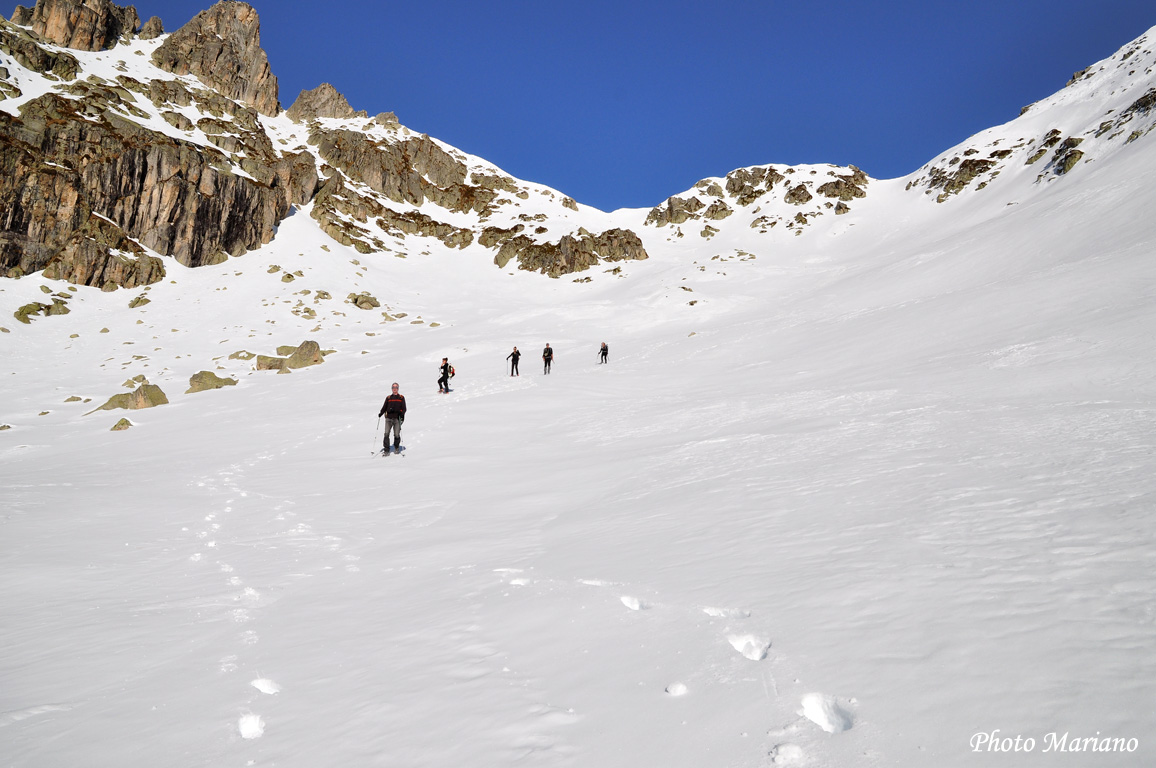 Vallon menant au col où la neige est bien cartonnée, mais également molle par endroits.