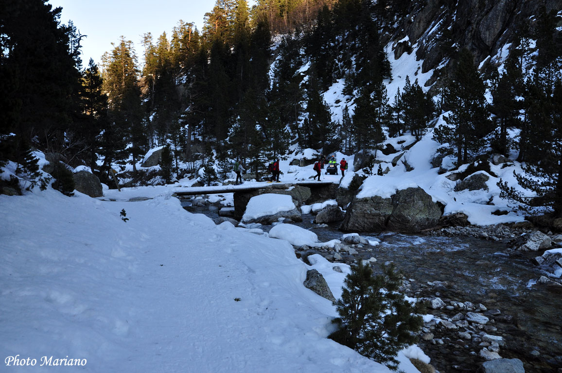 Mais, très vite nous traversons le pont du gave pour retrouver le sentier réservé aux raquettistes.