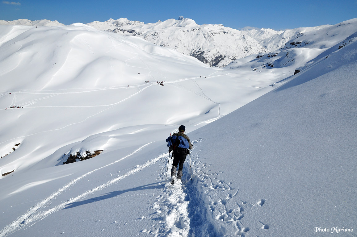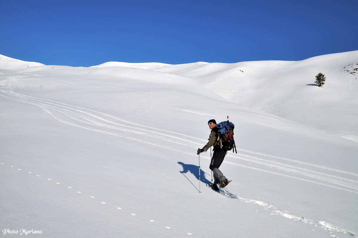 À cet endroit la neige est un peu molle, avec une pente à fort dévers, les raquettes ce n’est pas le top !