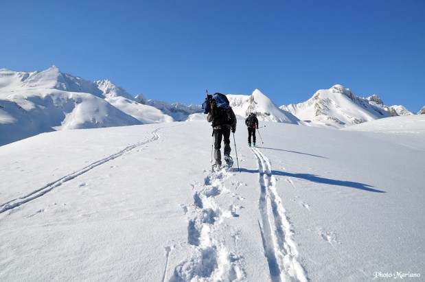 Jean-Luc est en ski rando alors que Jacques et moi-même sommes en raquettes à neige.
