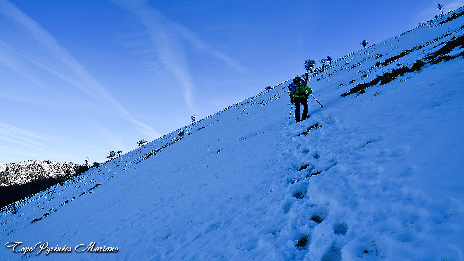 la première pente est vraiment très raide attention selon le risque d’avalanche car la neige ne repose que sur un tapis d’herbes qui ne retiennent rien du tout.