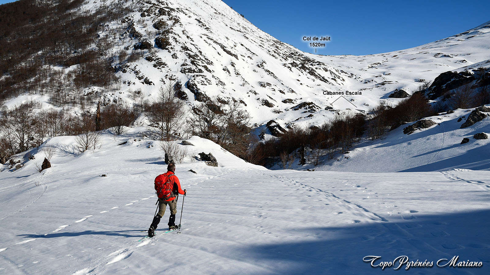 Belle boucle de retour sans difficulté si vous ne vous écartez pas de la trace. Sur cette photo, l’on peut voir où nous nous sommes arrêtés pour le casse-croûte (Mirador) et par où il faut redescendre (Coigt de Jaüt) pour rejoindre la piste près des cabanes d’Escala.