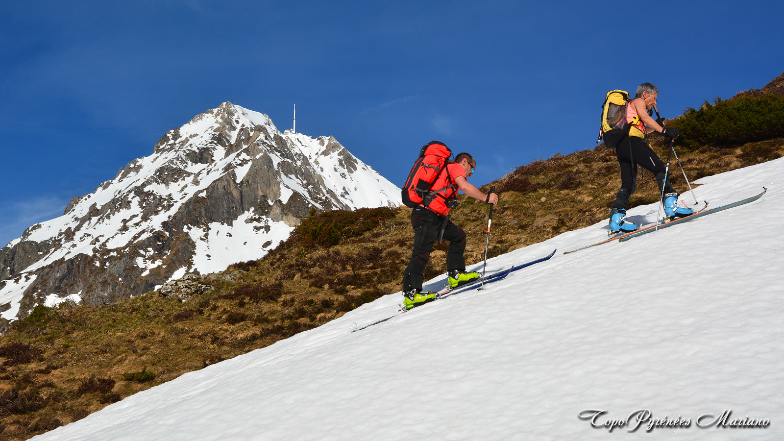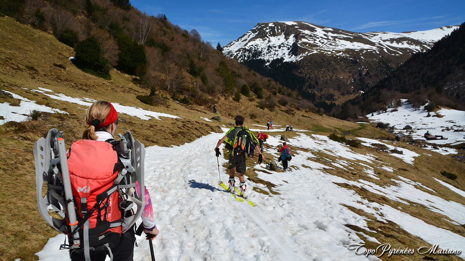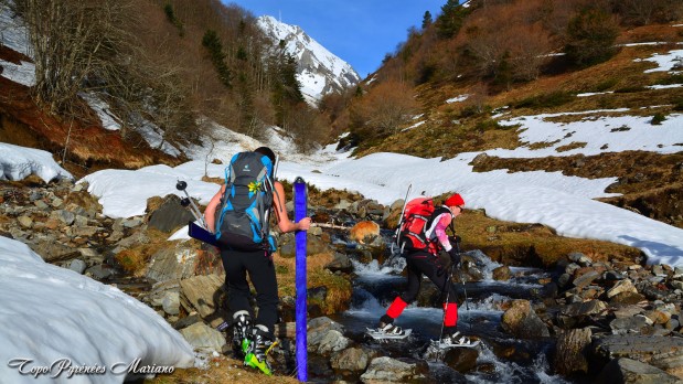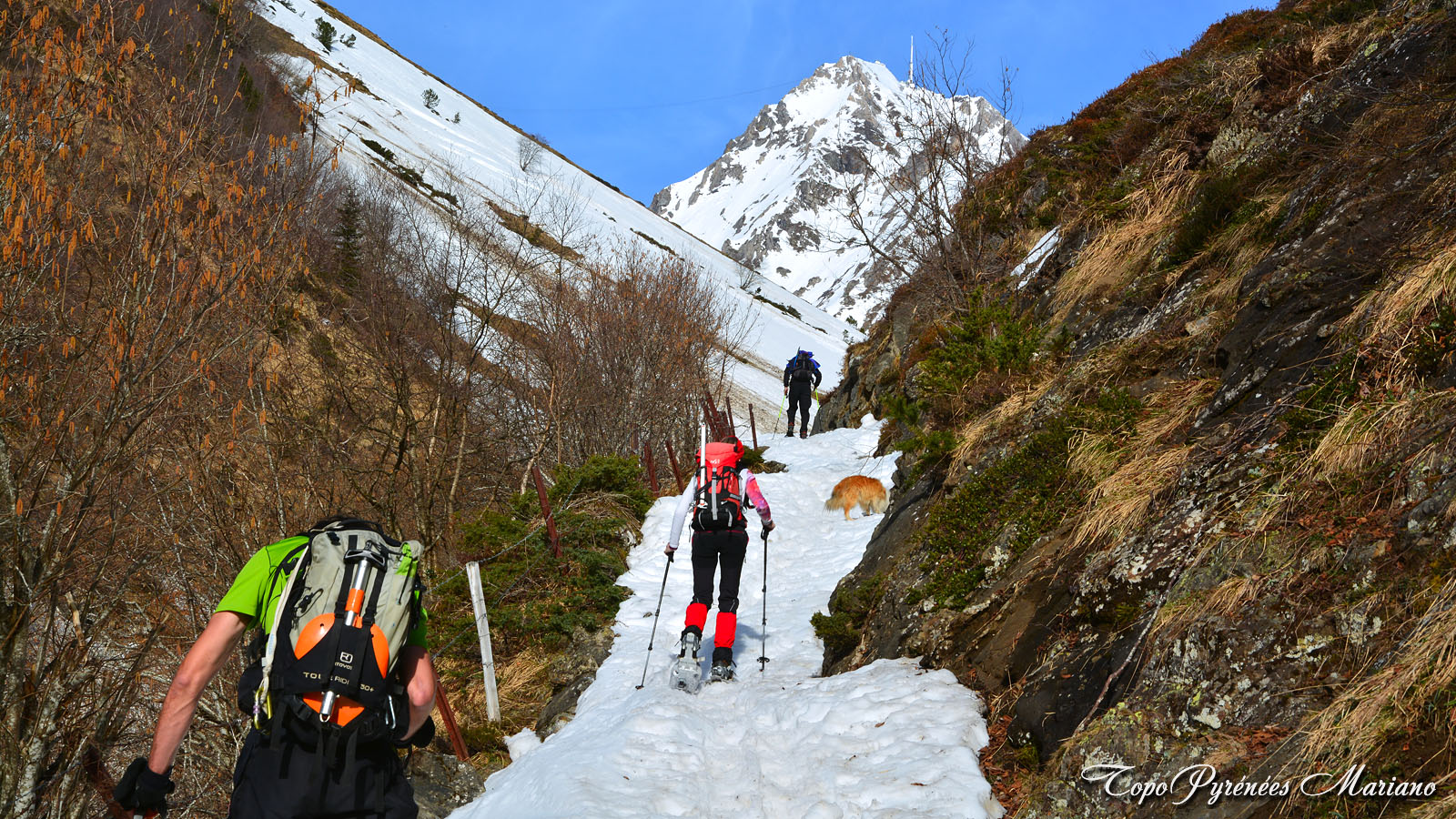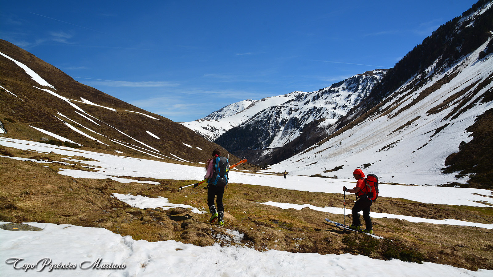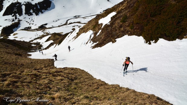 L’objectif de cette randonnée était au départ la Pène Lounque (2275m), mais le manque de neige nous a obligés à continuer un peu plus loin dans le vallon pour monter en direction du col de Ballonque. 1h10 depuis notre départ, à environ 1km de la cabane d’Arizes, nous remontons sur notre droite une goulotte enneigée en direction du Nord.