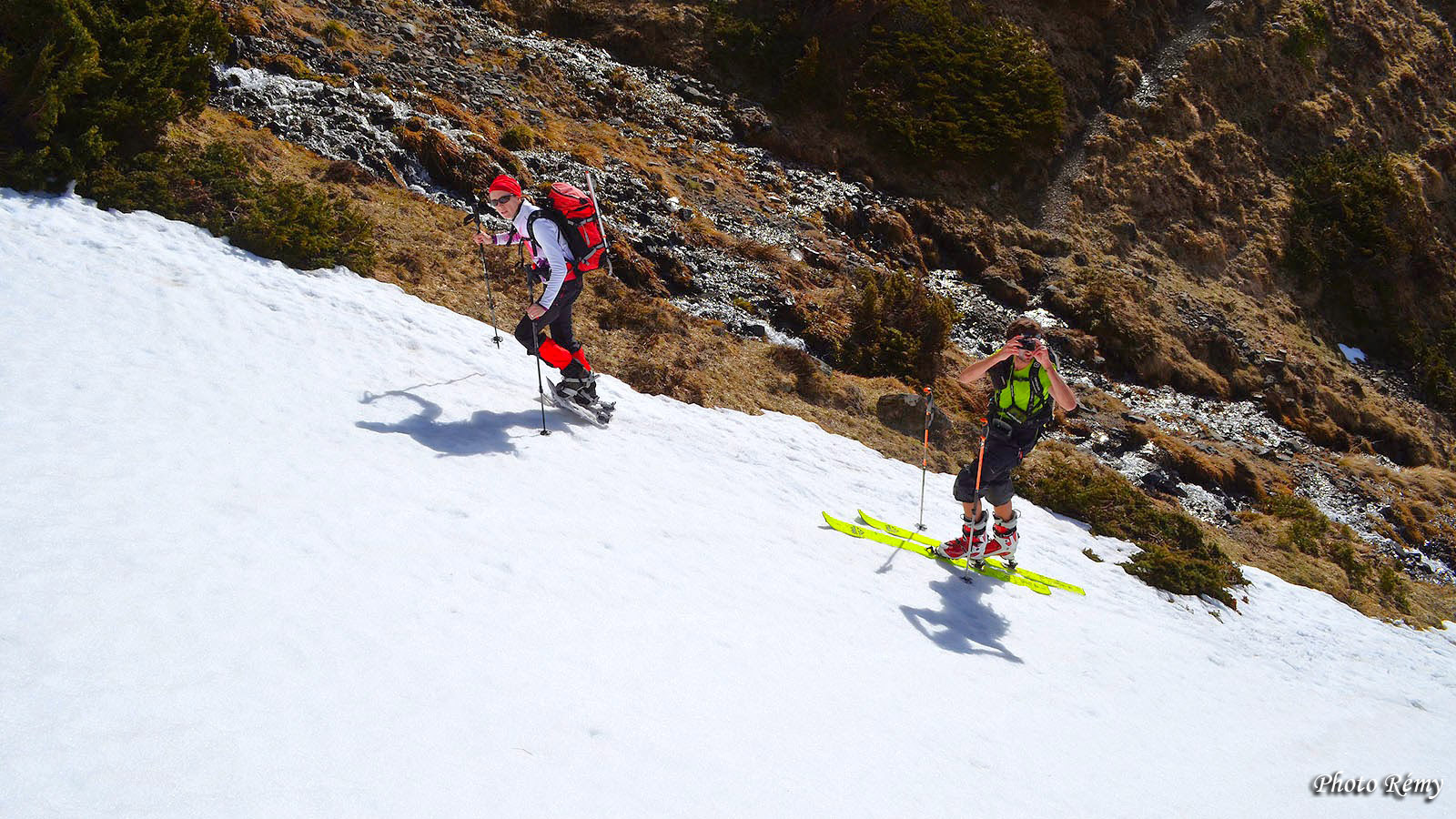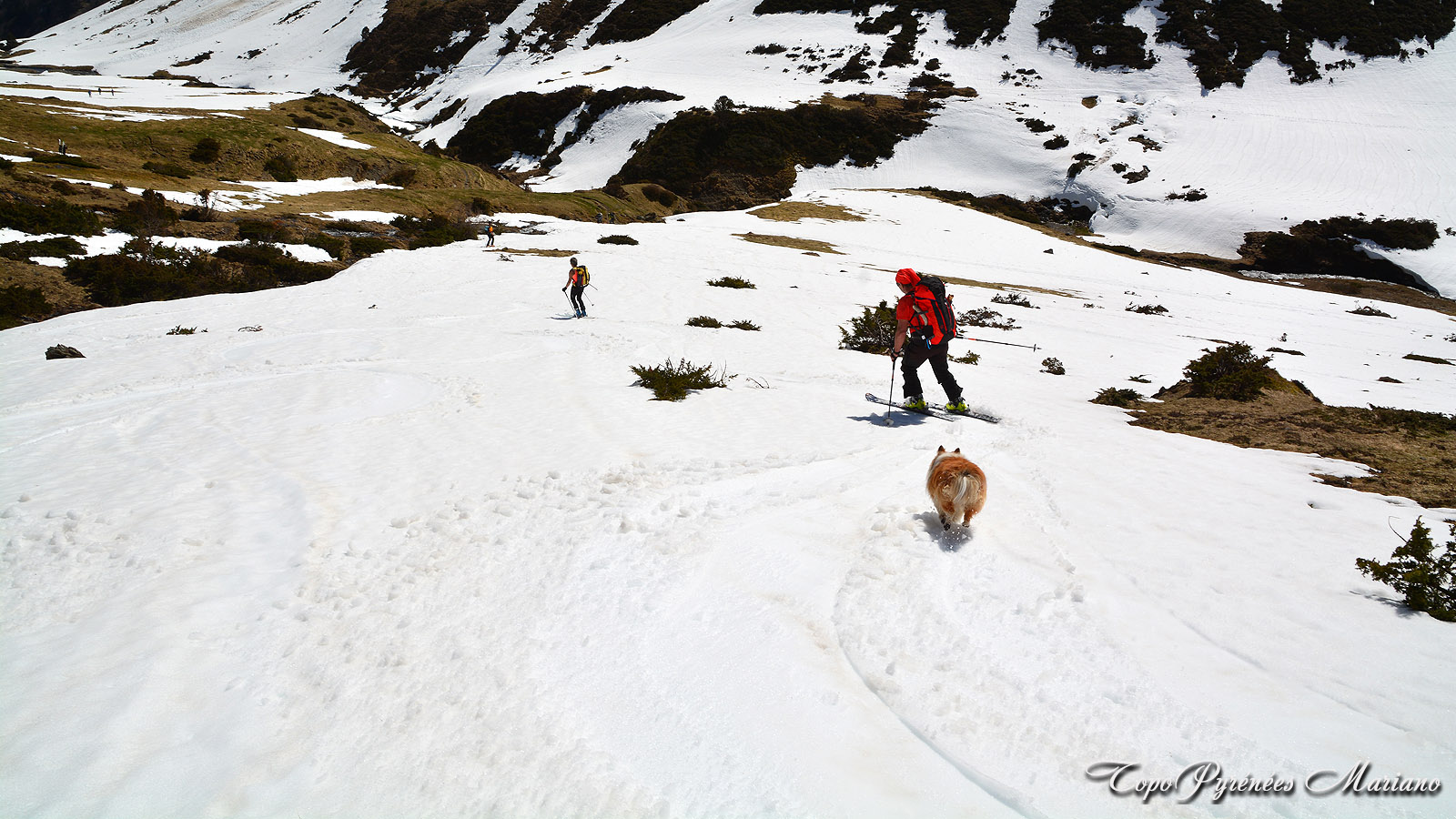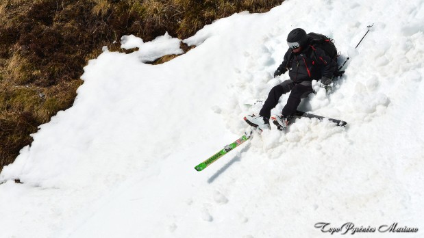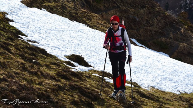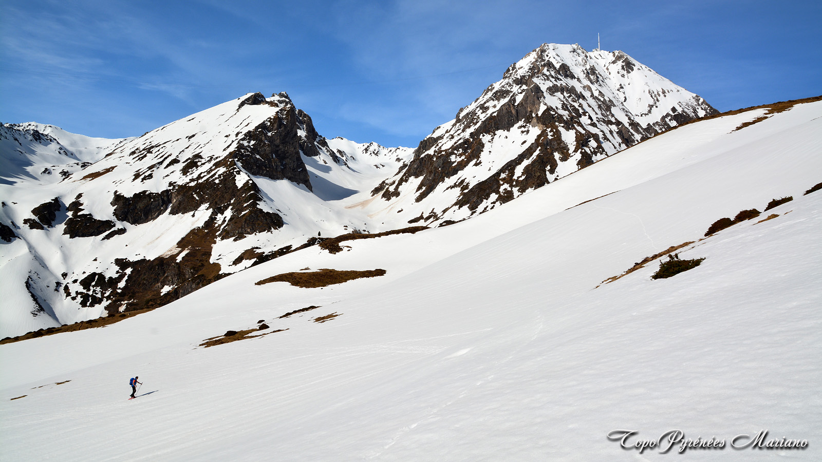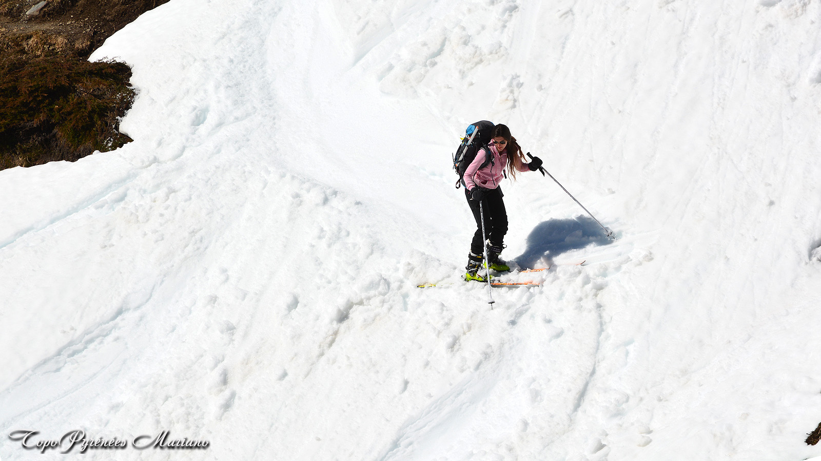 L’objectif de cette randonnée était au départ la Pène Lounque (2275m), mais le manque de neige nous a obligés à continuer un peu plus loin dans le vallon pour monter en direction du col de Ballonque. 1h10 depuis notre départ, à environ 1km de la cabane d’Arizes, nous remontons sur notre droite une goulotte enneigée en direction du Nord.