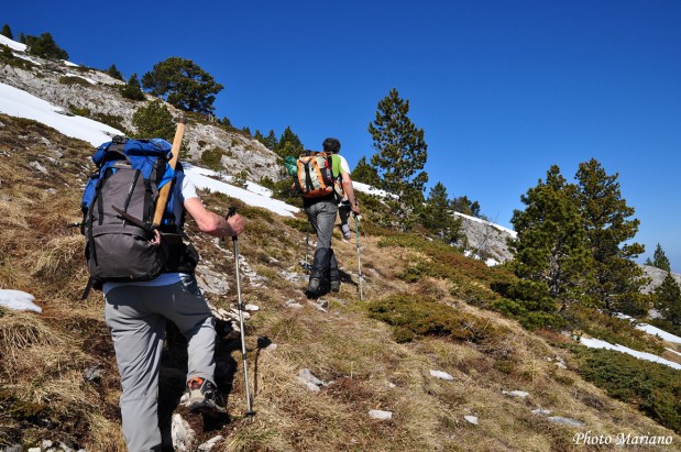 Quatre randonneurs descendent la voie de l’Anie.