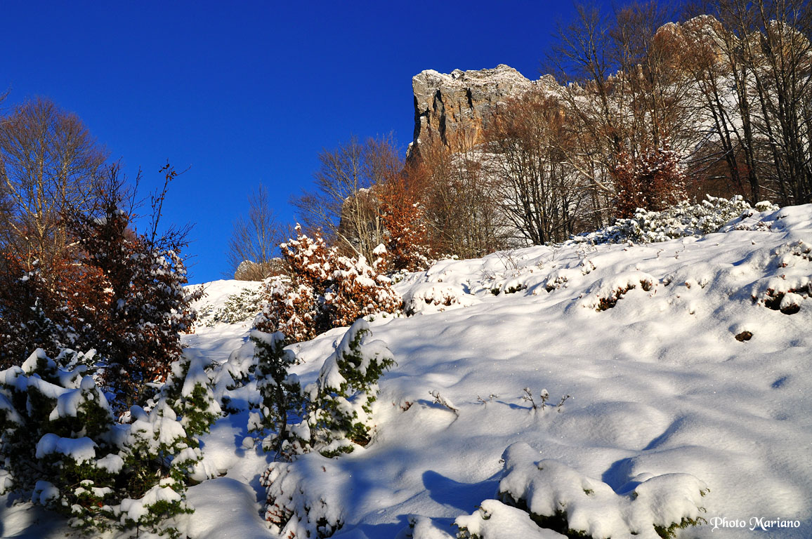 Avec ce froid (environ -3°), la neige tombée la nuit s’est figée sur les sapins pour le grand plaisir de nos yeux émerveillés.
