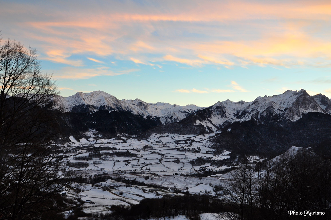 Le soleil se couche sur la vallée de Lescun pour clôturer cette magnifique journée hivernale.