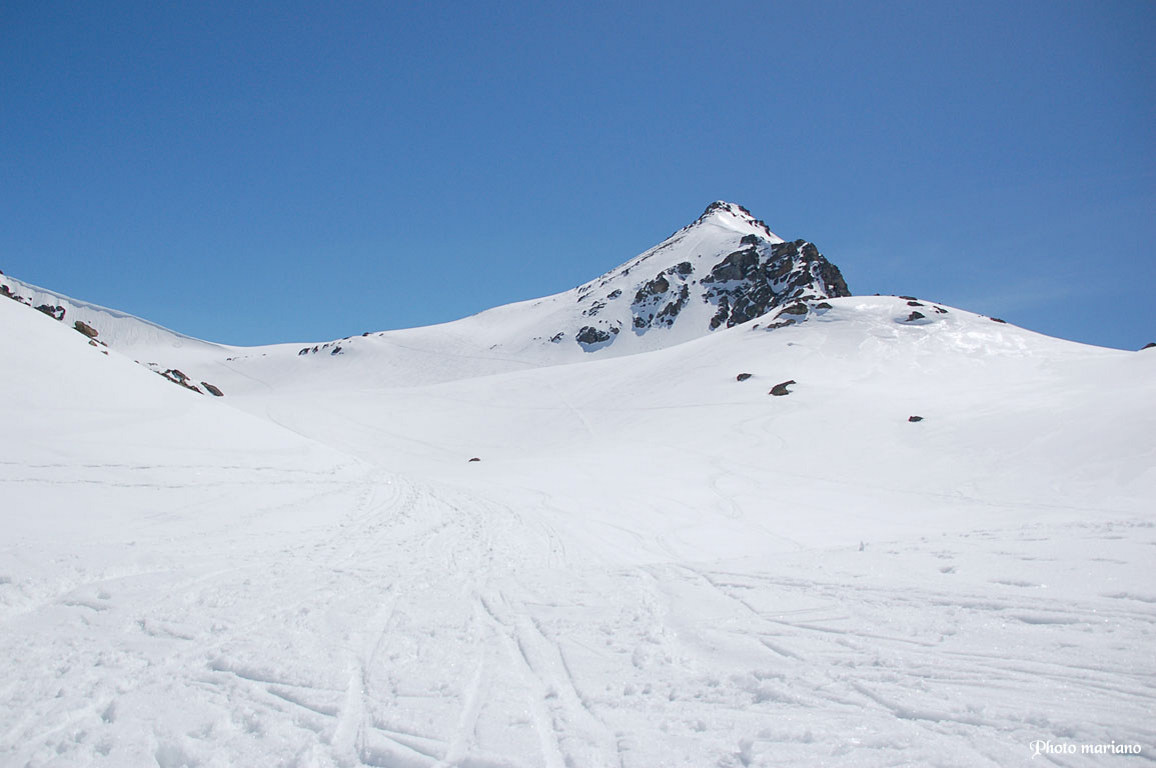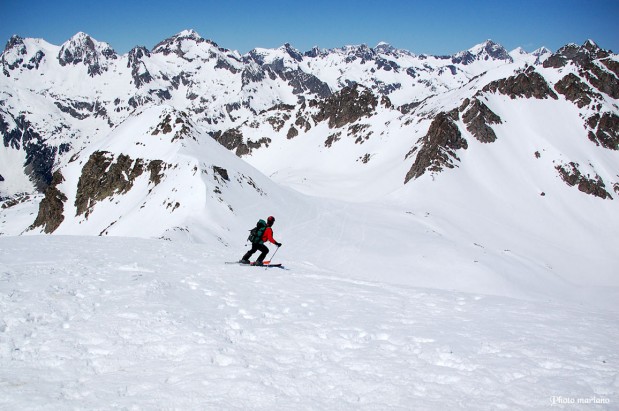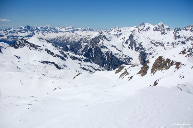 Vue sur le parcours en dévers du pic au col de Brazato 2578m.