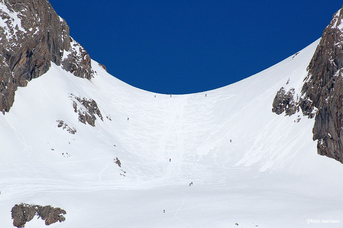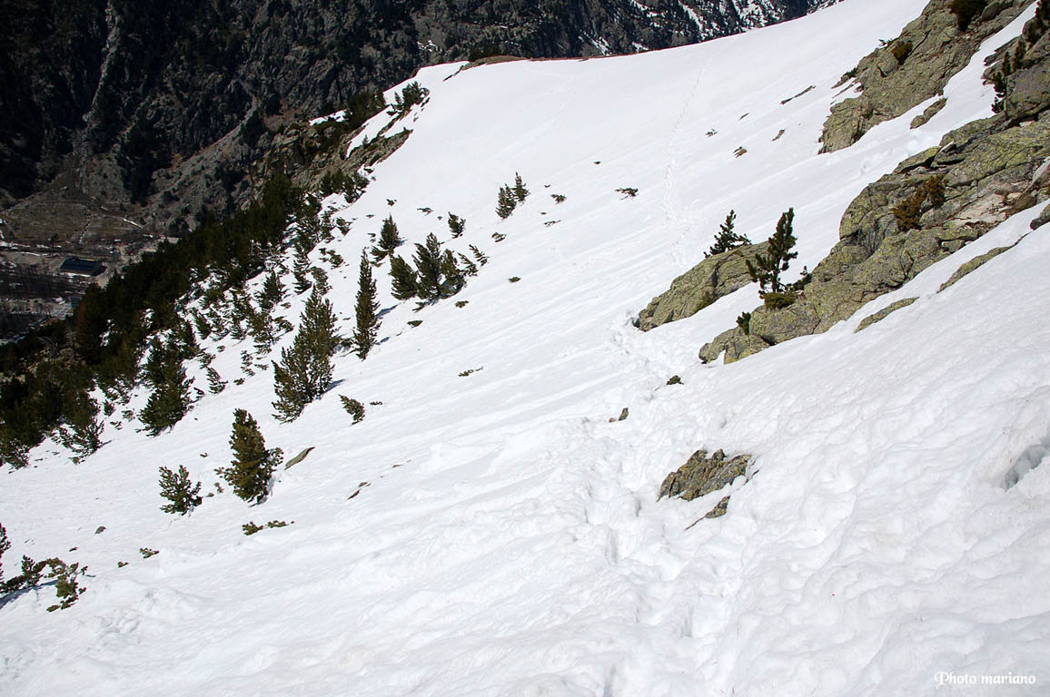 La pente est abrupte, et nous nous enfonçons parfois jusqu’aux genoux voire jusqu’aux cuisses. Ne pas descendre trop vite de façon à pouvoir s’arrêter immédiatement en cas où une des jambes resterait bloquée dans la neige (c’est bête, mais c’est des accidents qui peuvent arriver même jusqu’à la fracture).