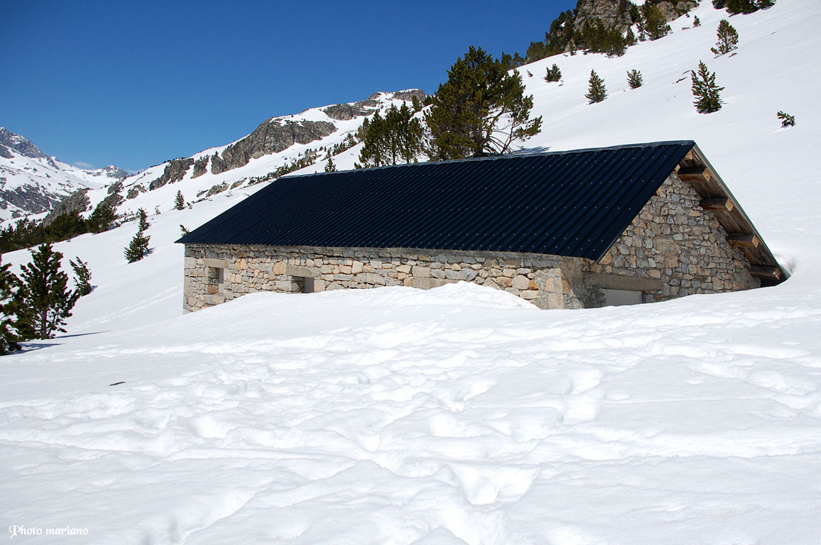 Altitude 1690m, deux possibilités: Poursuivre le chemin du Gr11 ou comme nous, contourner le bâtiment par la droite pour trouver une sente bien marquée. En hiver, il est préférable de faire comme nous, car côté GR11, le sentier est recouvert par la neige et la progression se fait un peu au jugé avec des pentes abruptes.