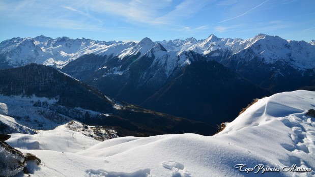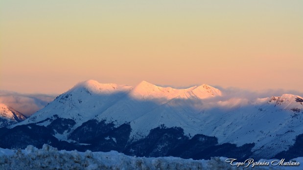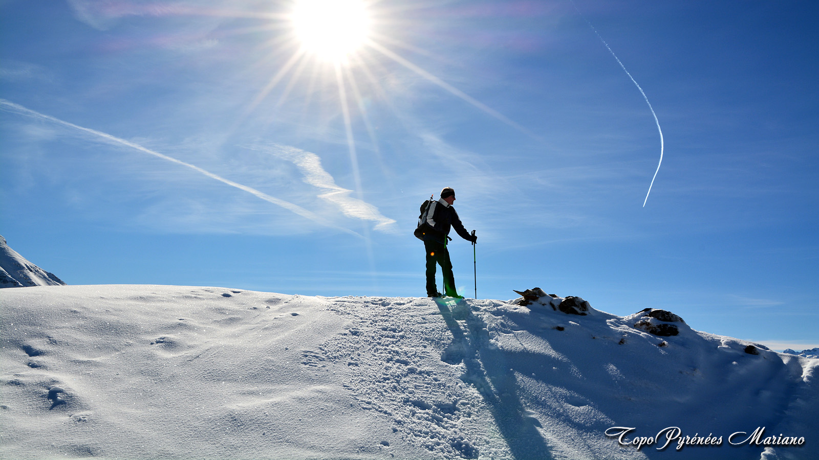 Il y a avait un peu de vent et quasiment plus de neige. La balade le long de la crête juste au dessus des nuages était un bonheur. Les vues sur les cirques d’Estibère au sud, le Pic du Midi de Bigorre à l’Est et le Pic de Viscos et le Moun Né à l’ouest valaient le coup d’œil.