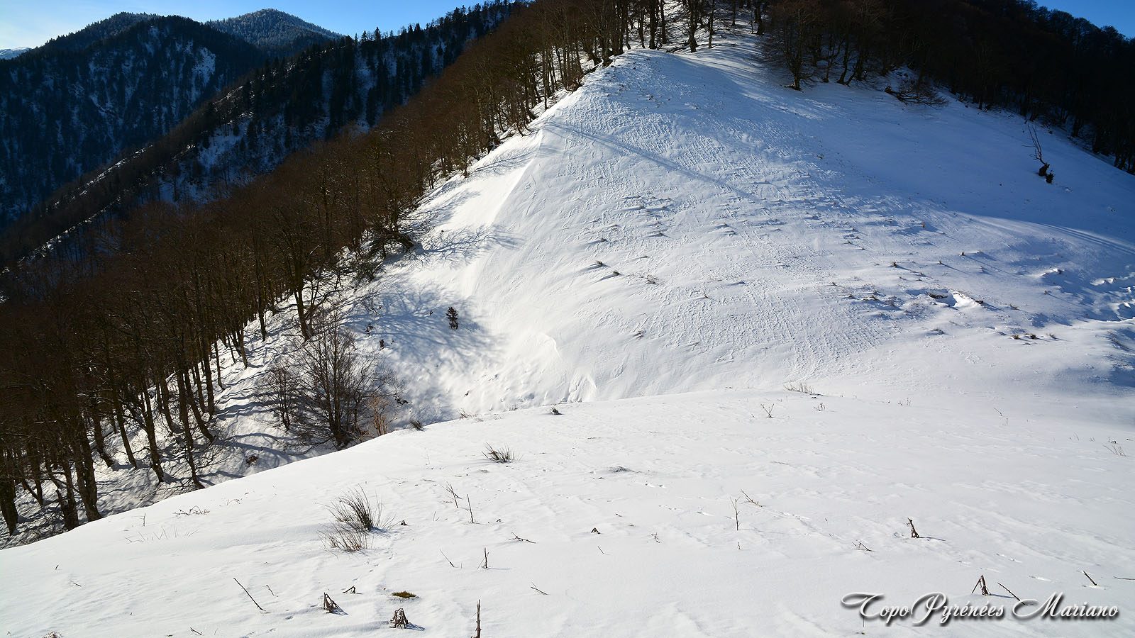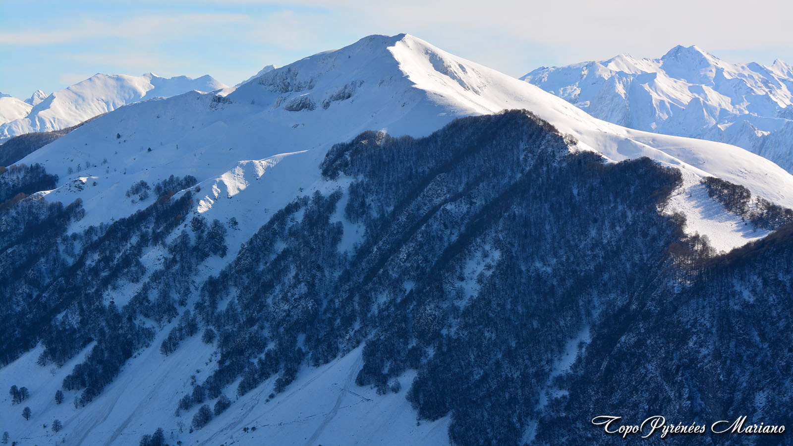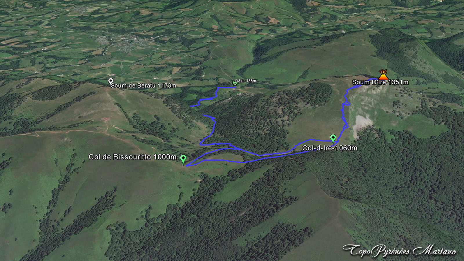 Depuis la piste la vue des 2 sommets que l’on peut faire depuis ce secteur: A droite le Soum de Bératu (1173m) et à gauche le Soum d’Ire (1351m), ils sont tous les 2 boisés côté versant Nord.