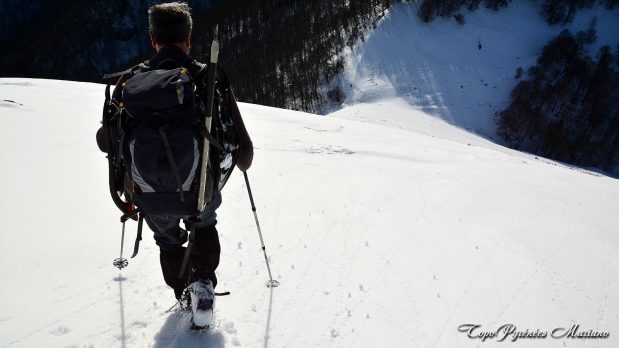 Après avoir franchi le ruisseau de Poussious, nous chaussons nos raquettes à neige.