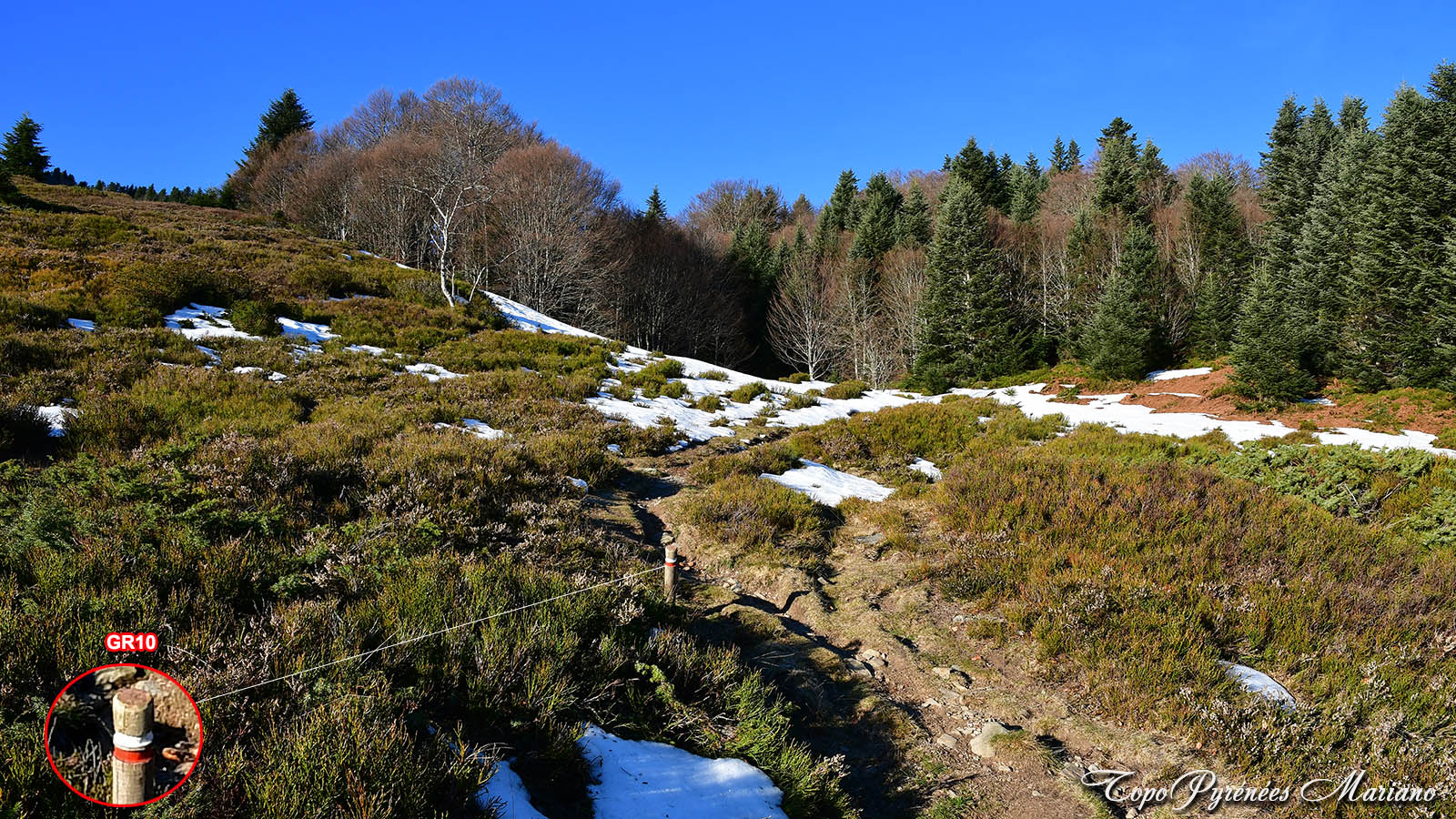 Depuis ce petit plateau, le sentier du GR10 remonte à droite en direction de l’Ouest.
