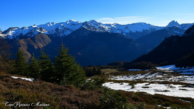 avec les sommets comme le Pic de Sesques (2606m) et le pic du Midi d’Ossau (2884m) à droite.