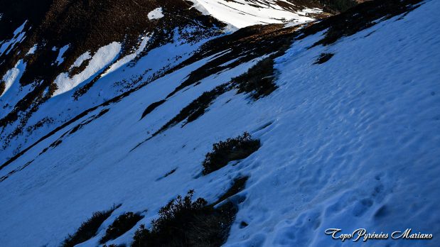 Après avoir atteint le col des Pises vers 1890m, l’itinéraire de la voie normale contourne légèrement ce mamelon par sa droite, sauf que lorsque la neige est vraiment trop dure comme aujourd’hui, il est conseillé de rester sur la ligne de crête même si la pente est un peu plus inclinée.
