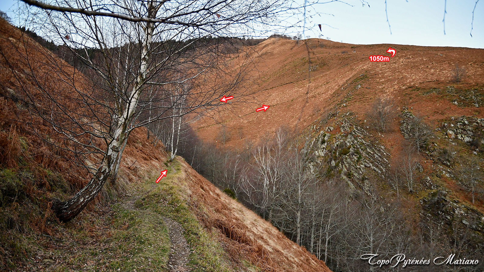 traverser le ruisseau de Boussoum, puis remonter le sentier jusqu’à l’altitude 1050m (Est).
