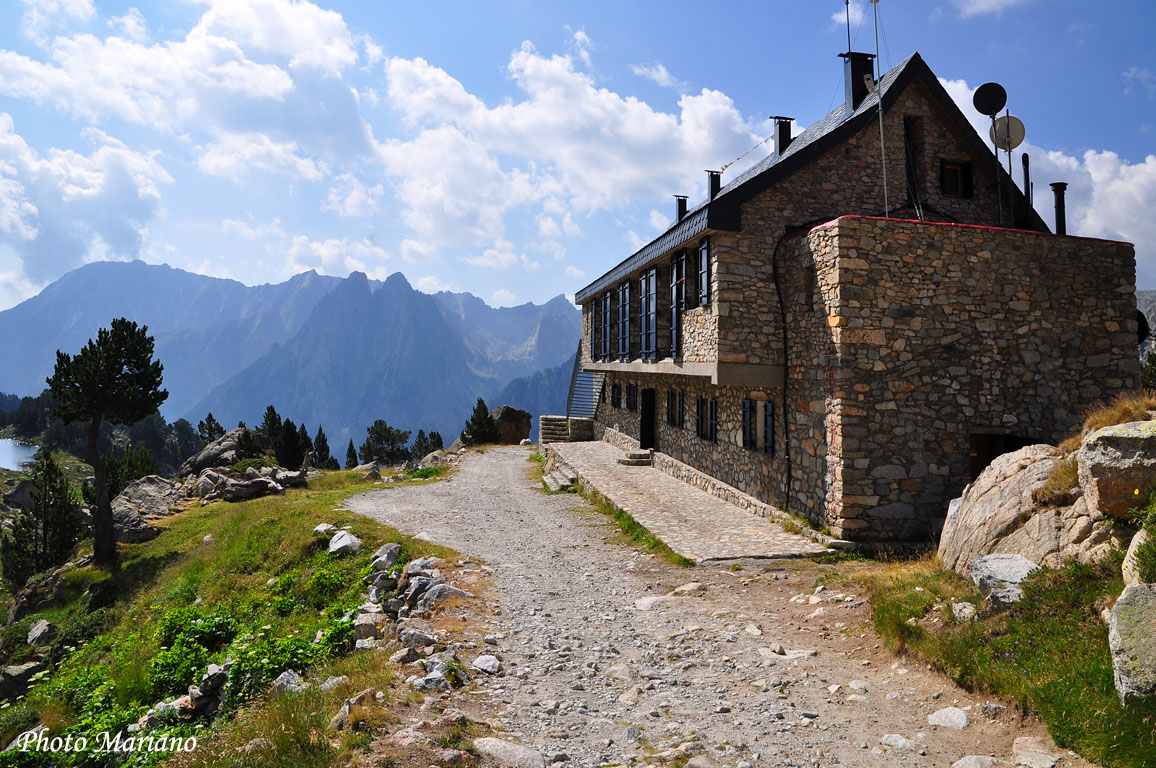 Le refuge d’Amitges 2380m avec en arrière-plan, les aiguilles des Encantats qui affleurent les 2 747m.