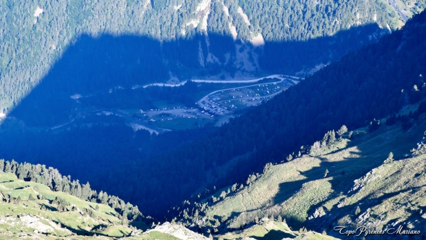 et la vue plongeante sur le parking et le refuge de Bujaruelo.