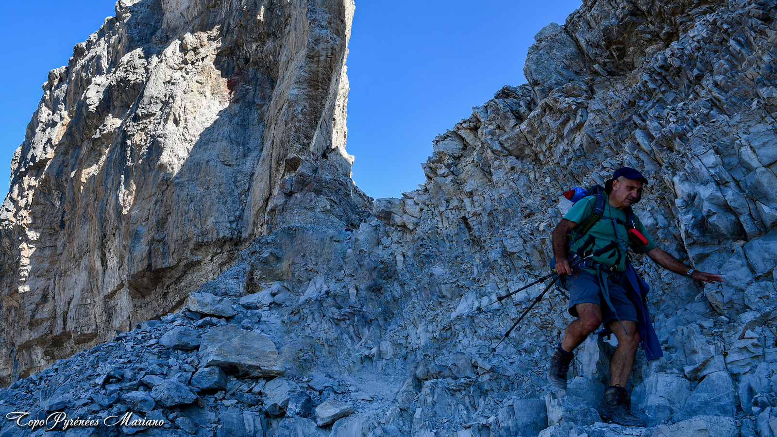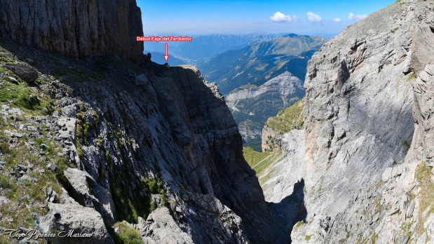 • La Faja del Tardiador est la plus belle et la plus sauvage des trois, mais aussi potentiellement la plus dangereuse, sans être très difficile, la vire se déroule sur un sentier très étroit par endroit où la vigilance est de rigueur, il faut en permanence rester concentrés pour éviter une glissade qui serait fatale à coup sûr ! elle comporte également 2 passages qu’il faut désescalader sur 2m50 (Niv: II+ voir un pas de III). Pour ceux qui veulent éviter cette vire Tardiador, il vous suffit de descendant directement à la vire des Fleurs depuis la Punta de Escuzana ou depuis le col de Mondarruego sans aucune difficulté.